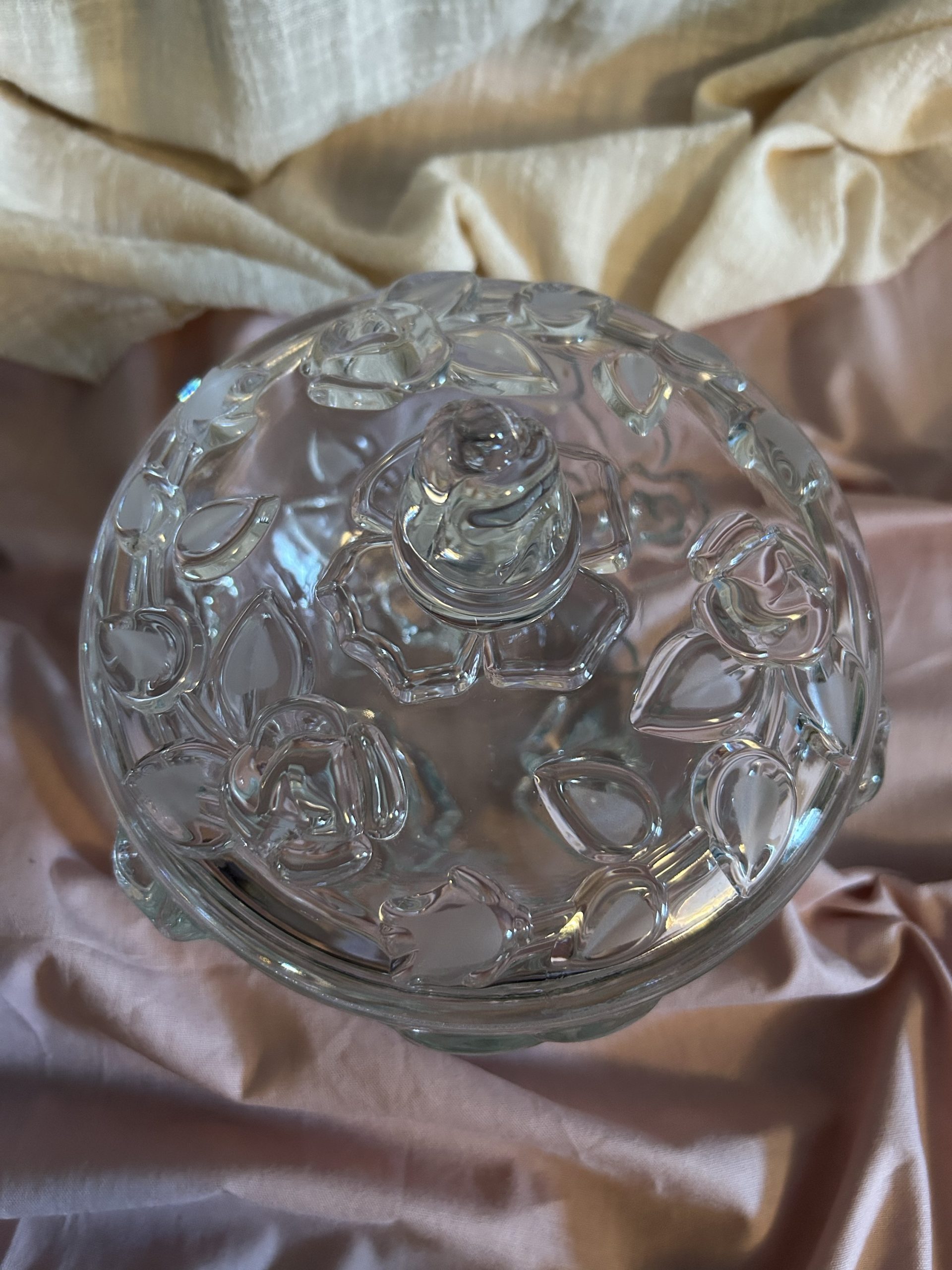 Jolie petite bonbonnière sur pieds ornée de fleurs transparentes gravées en relief. Elle fera sensation posée sur une étagère ou dans un vaisselier pour y ranger des petites gourmandises. Elle peut aussi servir à créer un pot pourri ou ranger des petits bijoux ou accessoires.